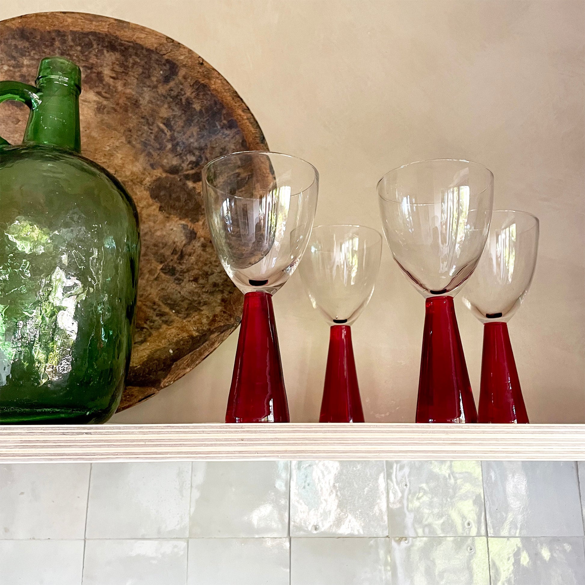 Vintage set of four ruby-red stem wine glasses by Artland Prescott, mouth-blown in the UK.