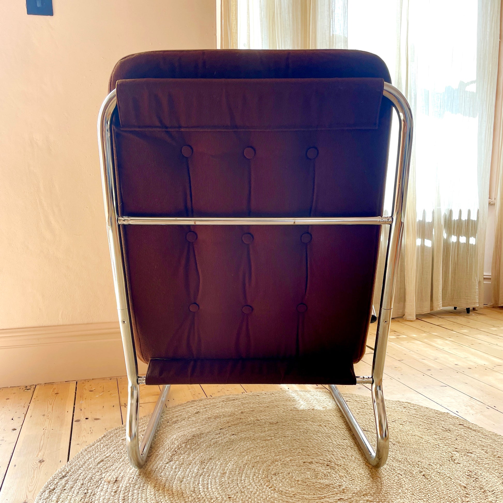 Upholstered in a synthetic brown corduroy fabric with padded armrests and button-tufted back and seat.