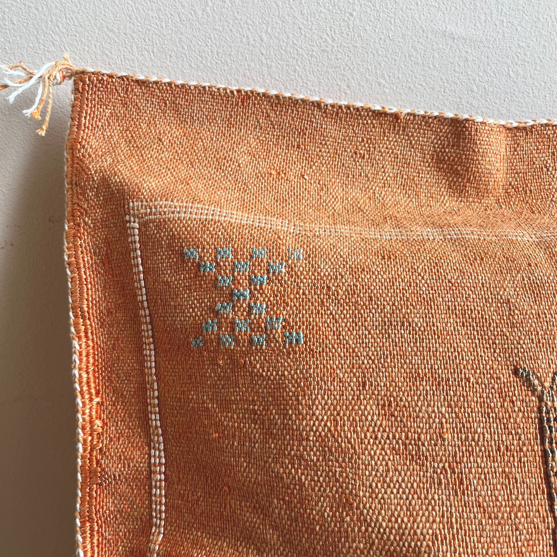 Hand-woven cactus silk cushion in a burnt orange with light, white blue and beige embroidery.