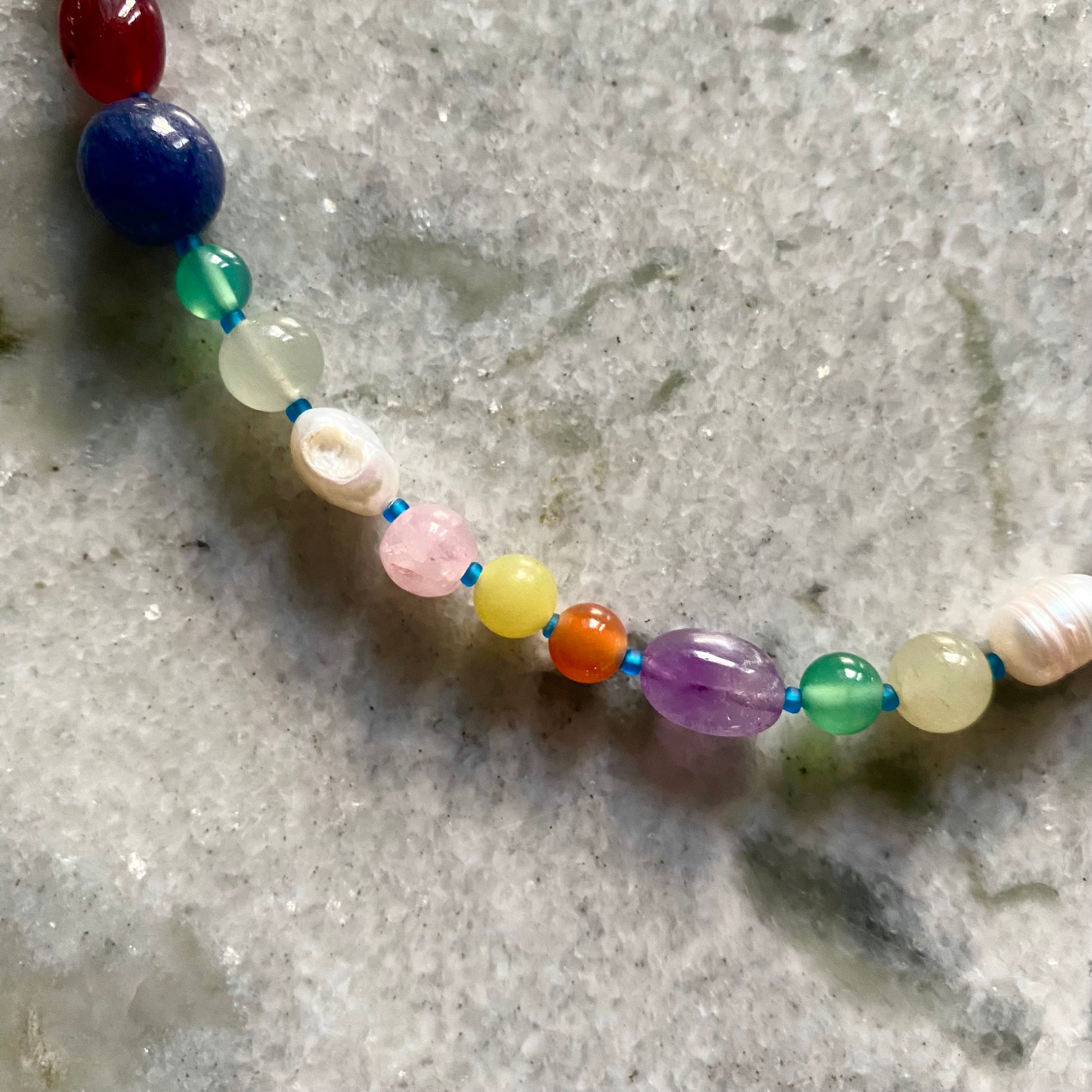 One-of-a-kind choker necklace by Sunny Sands House. Made using vintage semi-precious stones, freshwater pearls and Japanese glass beads, this necklace also features an 18 carat gold-plated clasp.