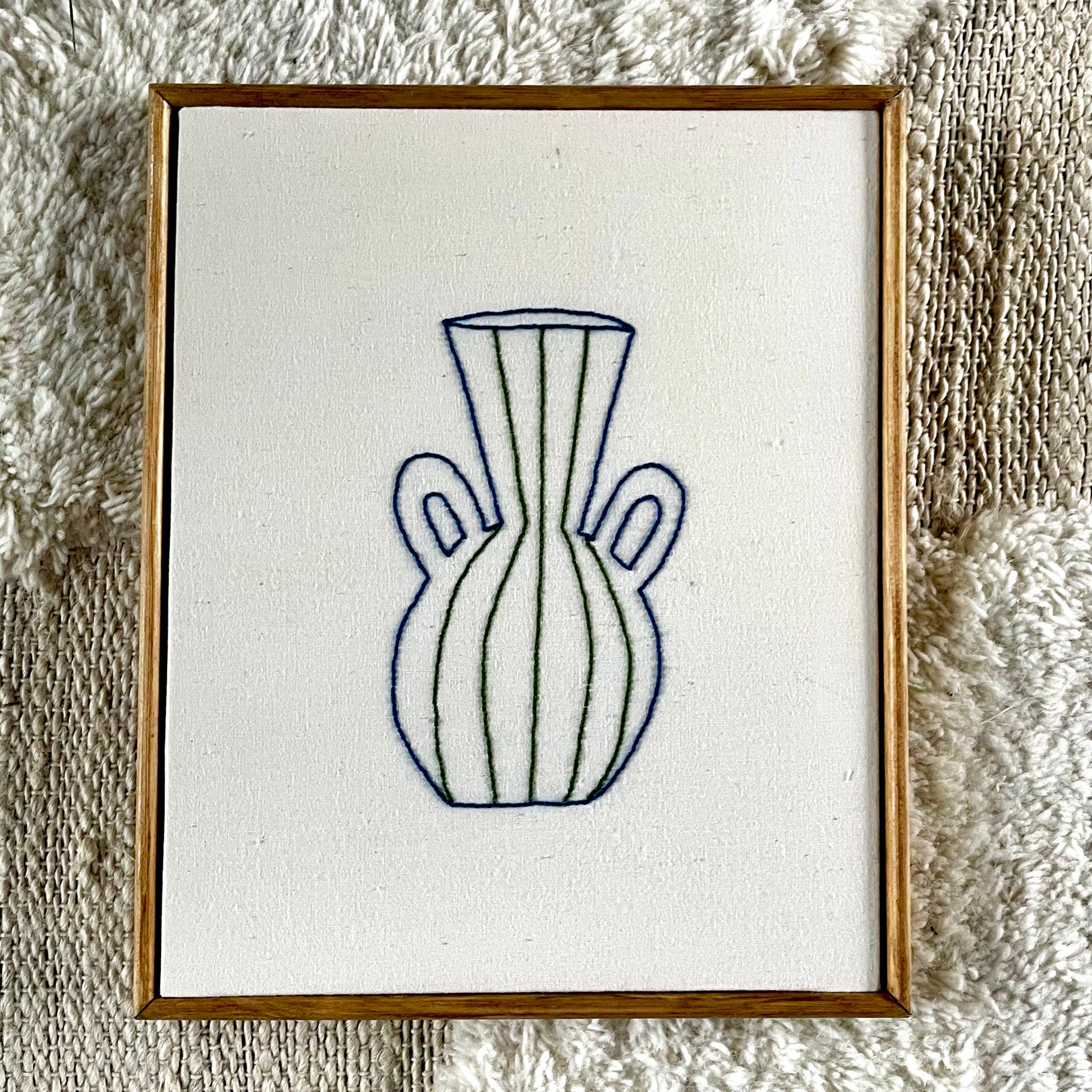 Striped Amphora urn hand embroidered in blue and green on unbleached calico with wooden frame.