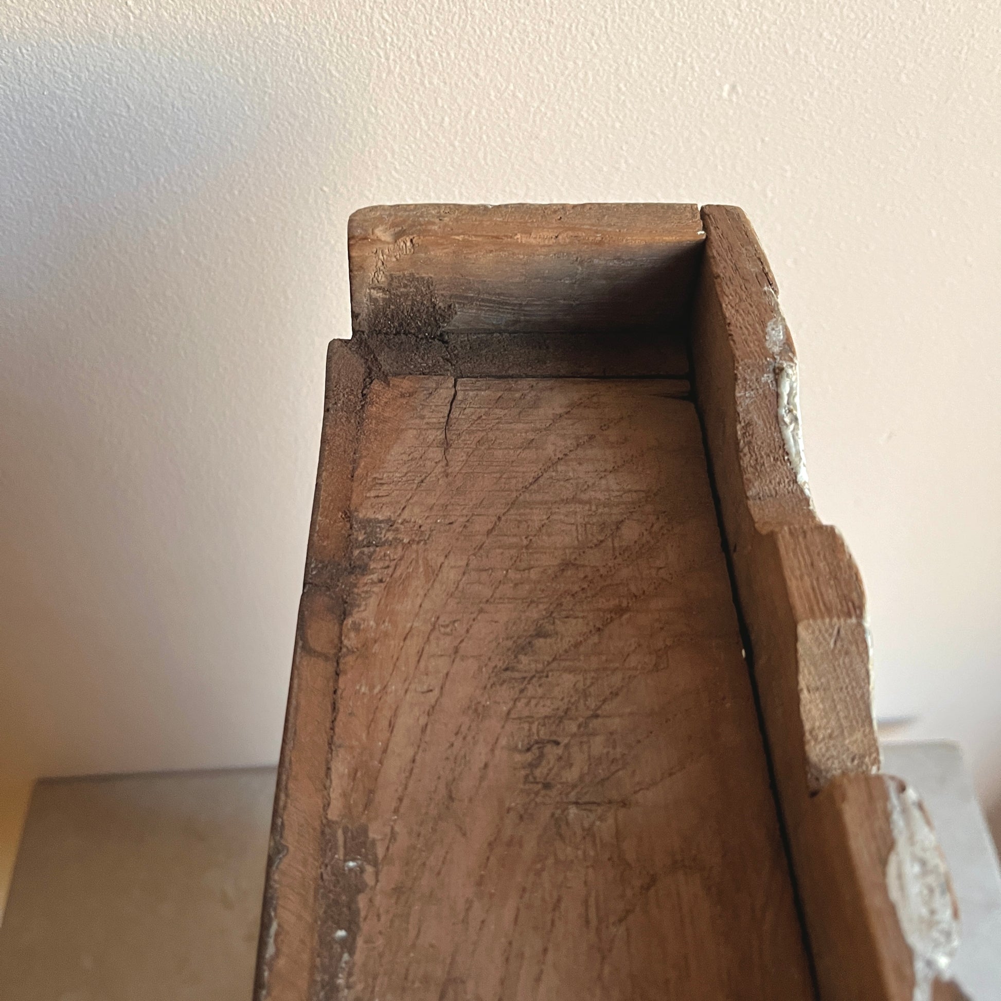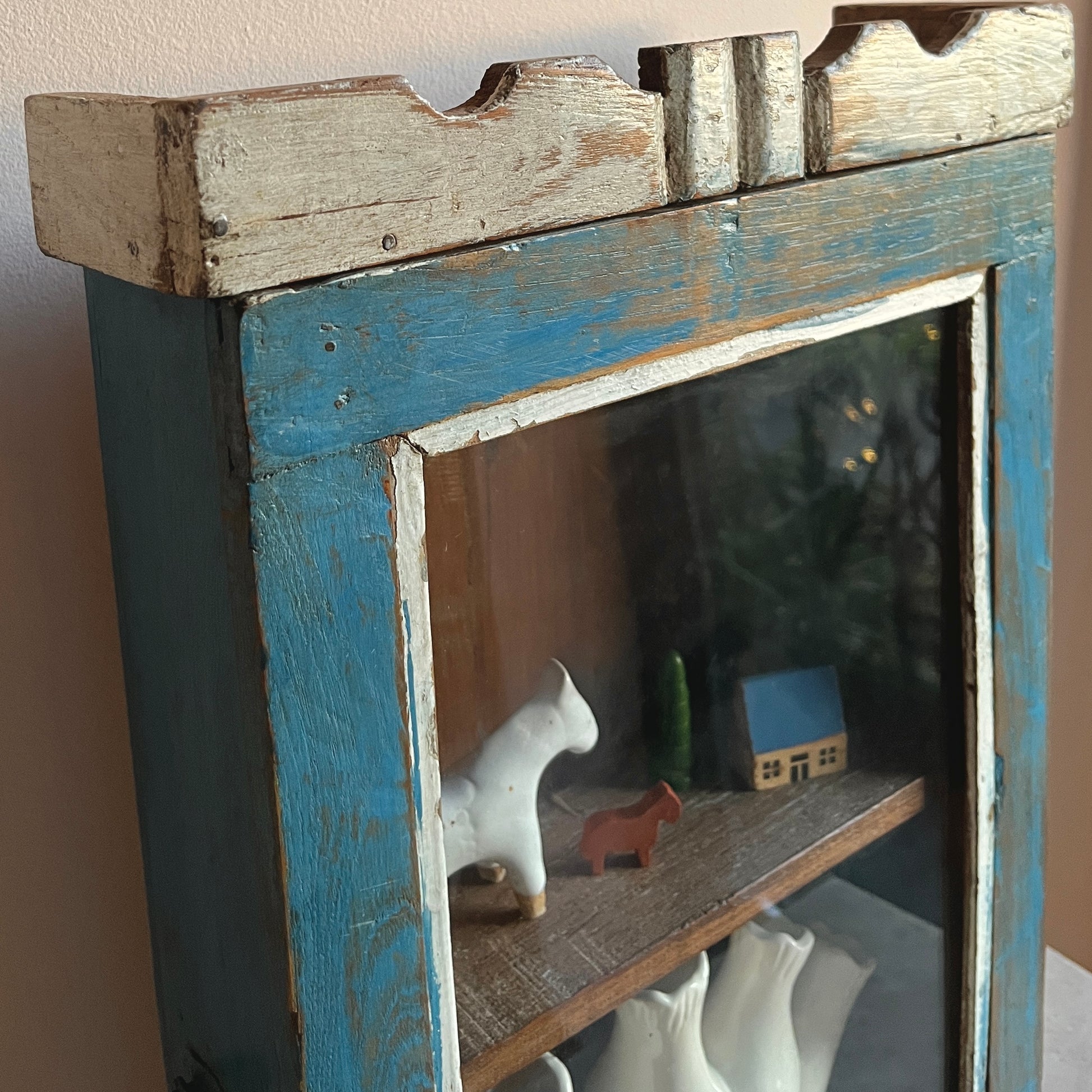 A small antique Indian cabinet made from dark wood featuring a beautifully distressed blue and white exterior.The interior remains its original natural wood colour. Pretty carved detailing adorns the top and bottom.