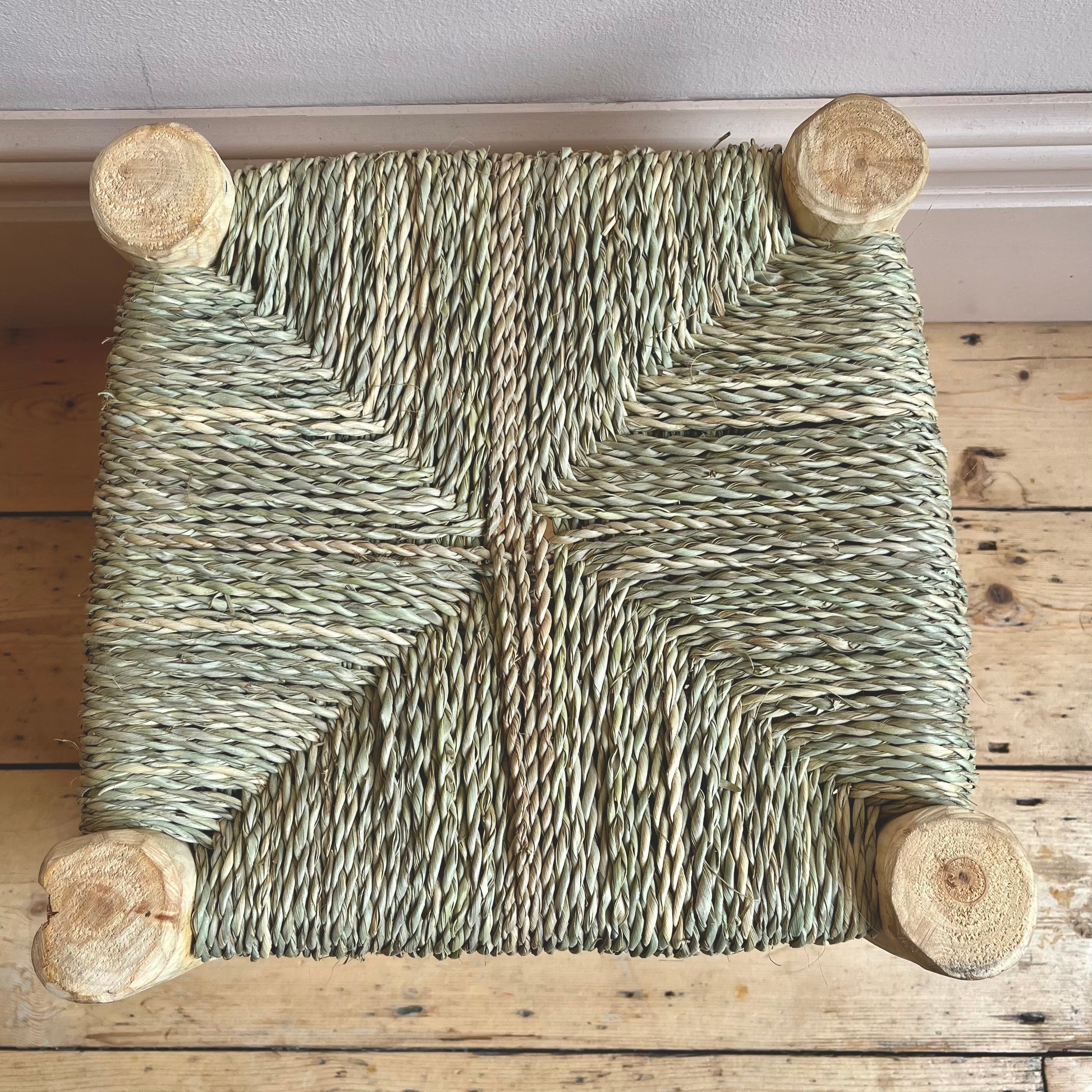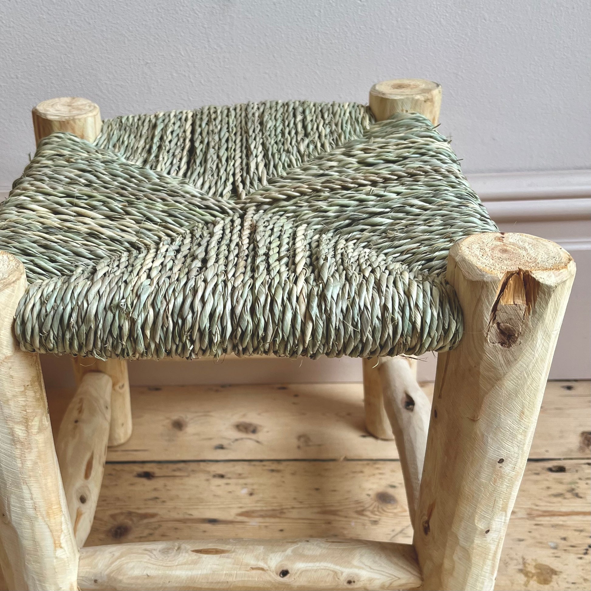 Handcrafted rustic wooden Moroccan stool. Beautifully made with wicker rope and laurel wood.