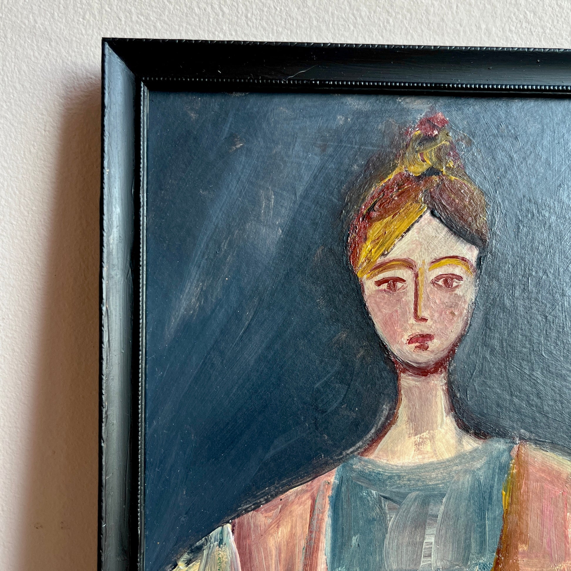 This oil painting showcases a colourful depiction of a female in a modernist style.