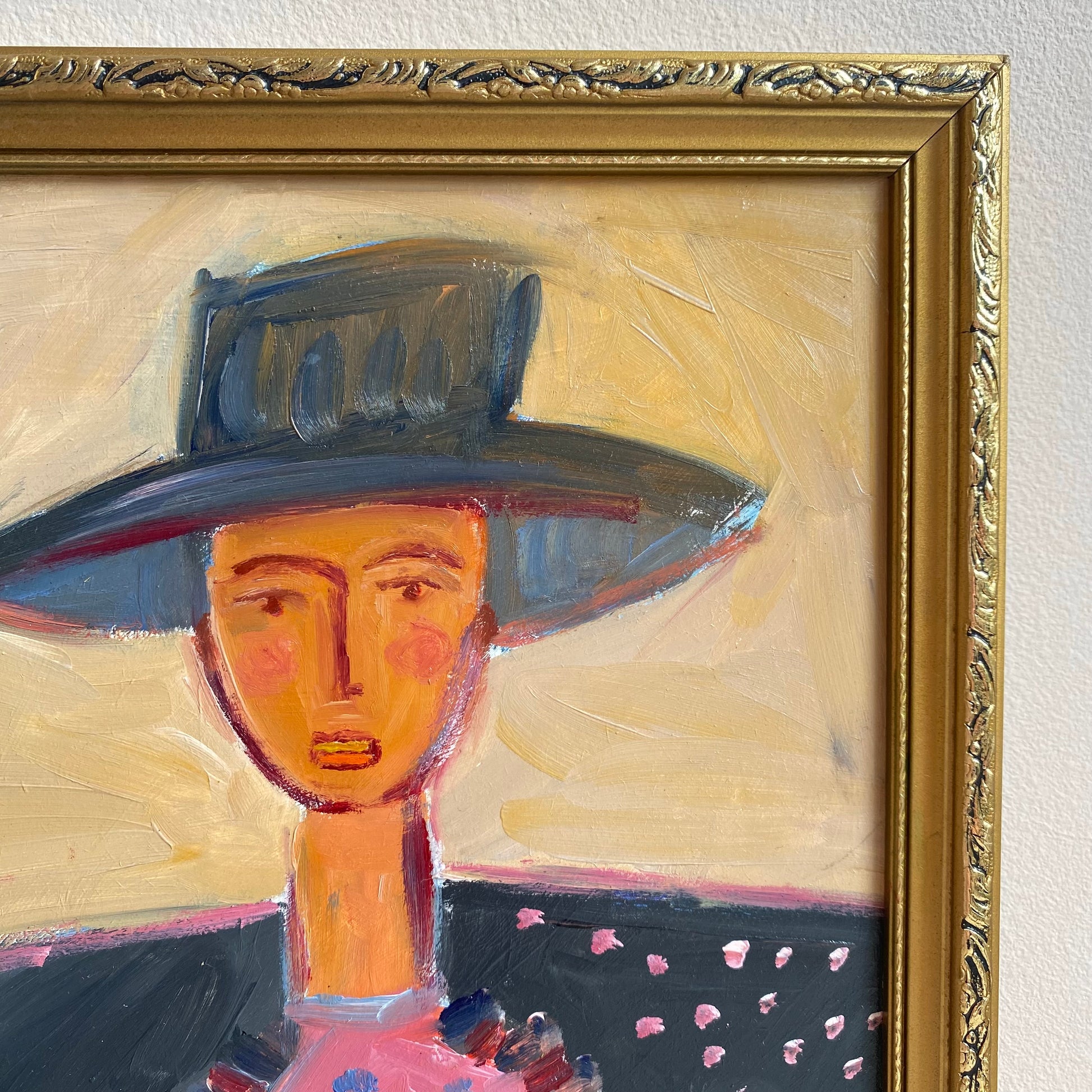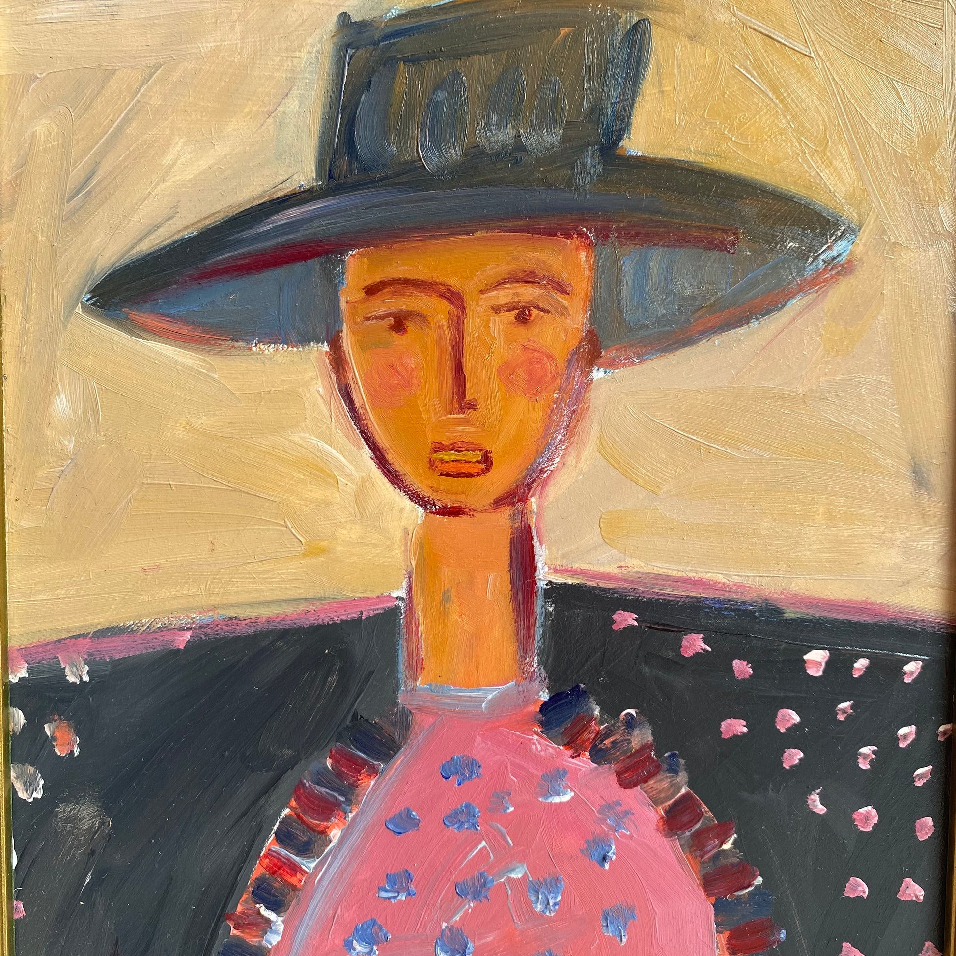 This beautiful oil painting showcases a colourful depiction of a girl in a hat in a modernist style.