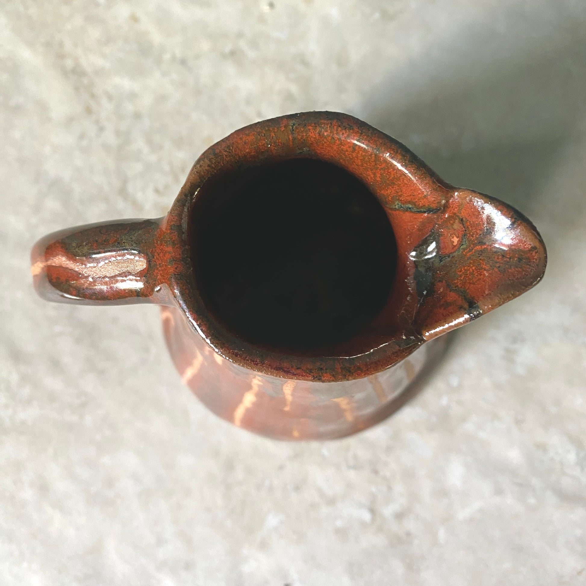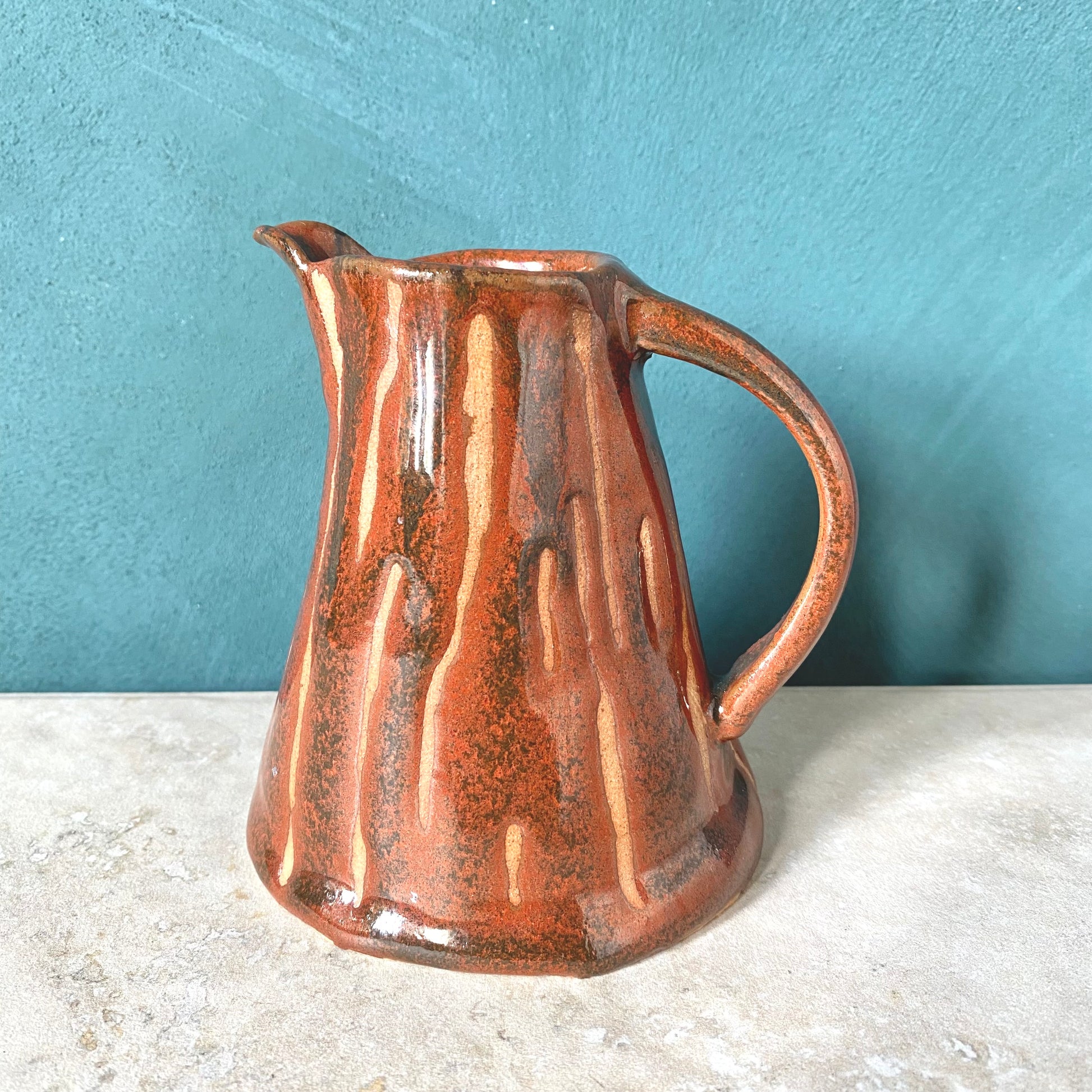 Cute hand-built studio pottery jug in a warm terracotta drip glaze.