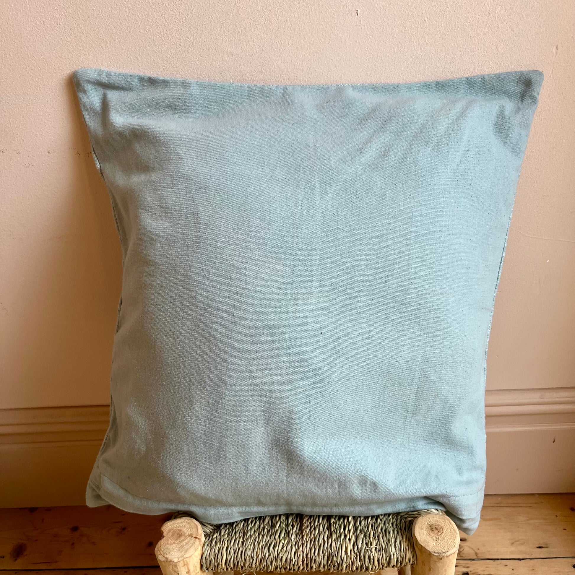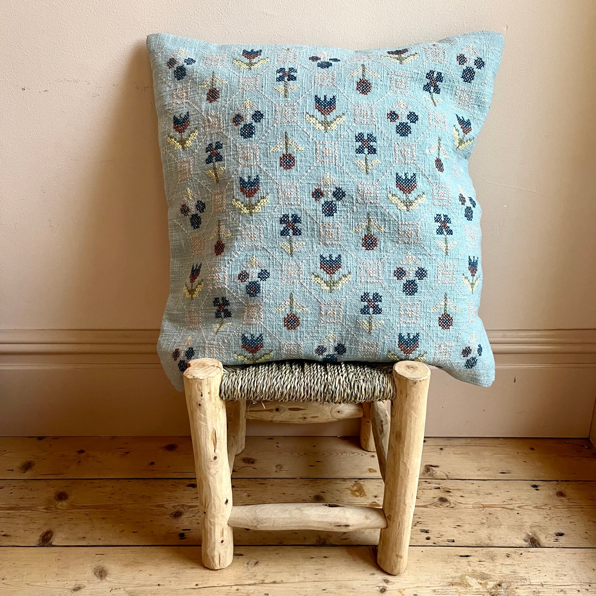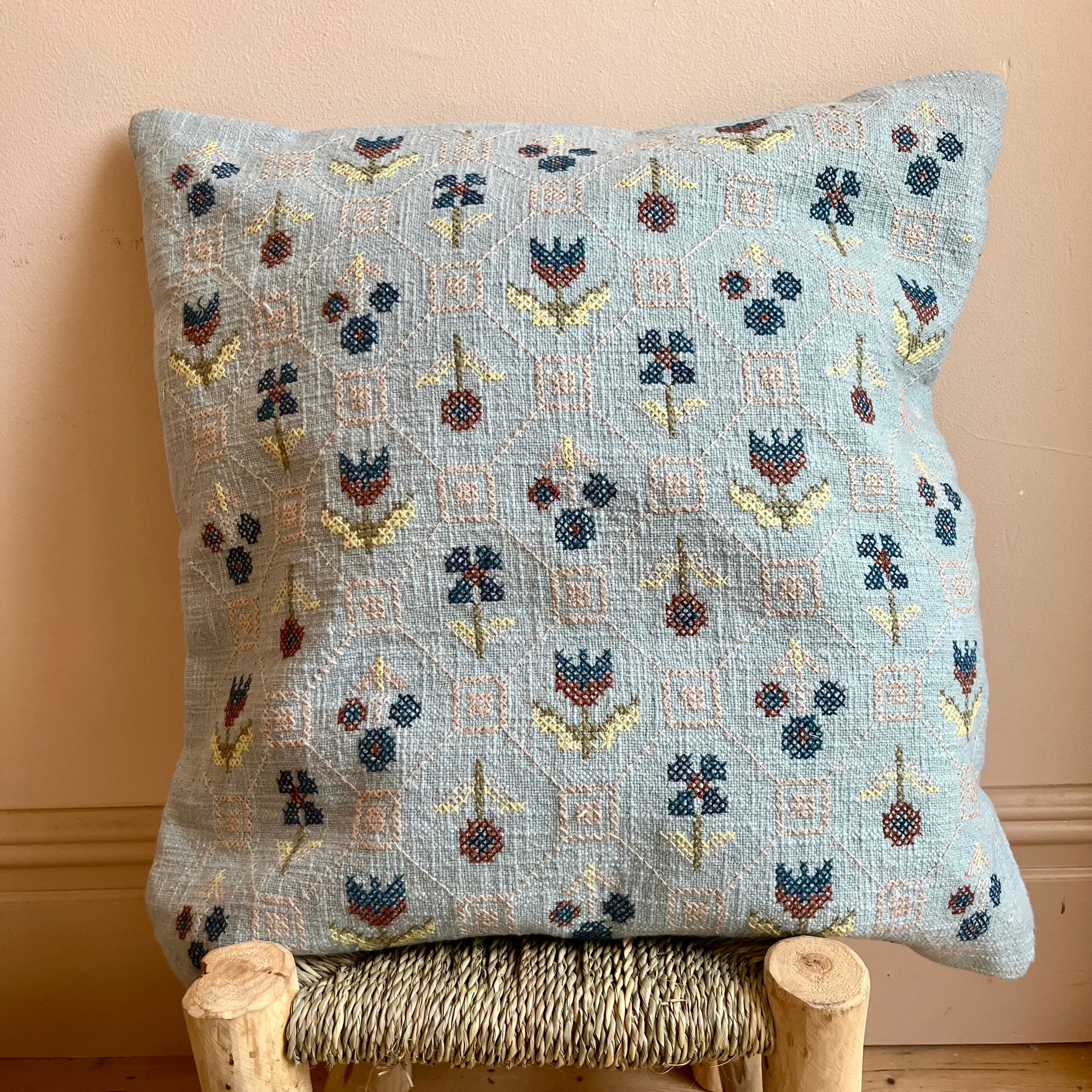 Crafted in a duck blue woven fabric, the front features a floral cross stitch design , arranged in a harlequin pattern.