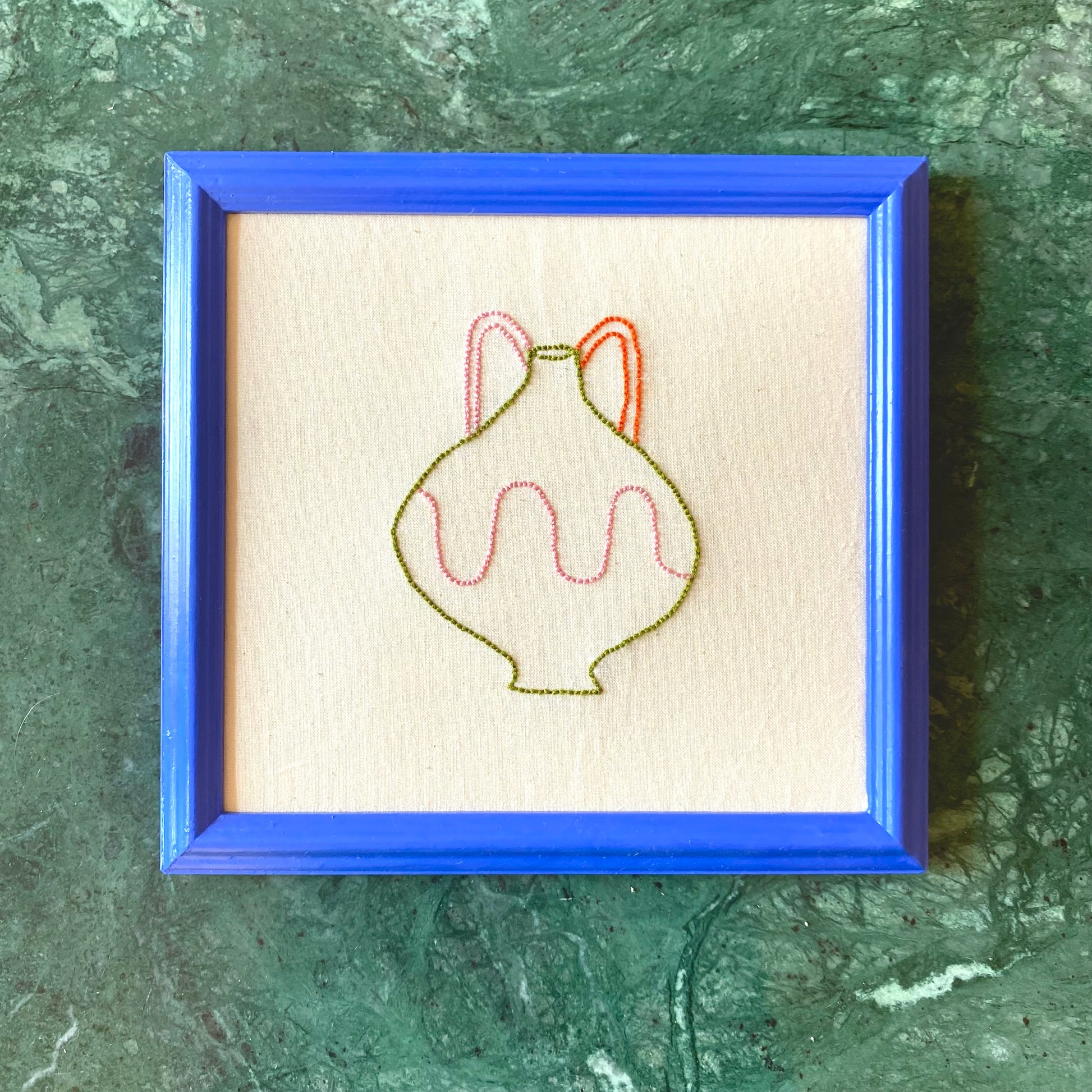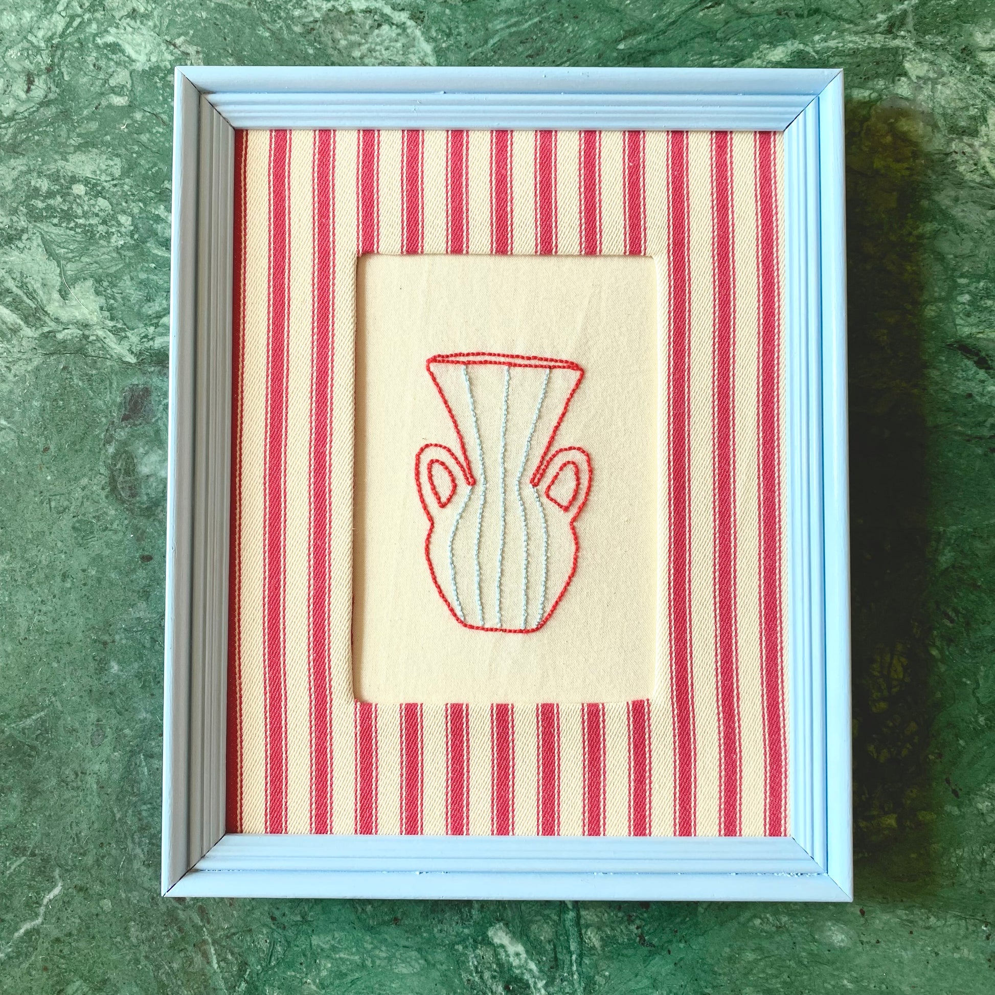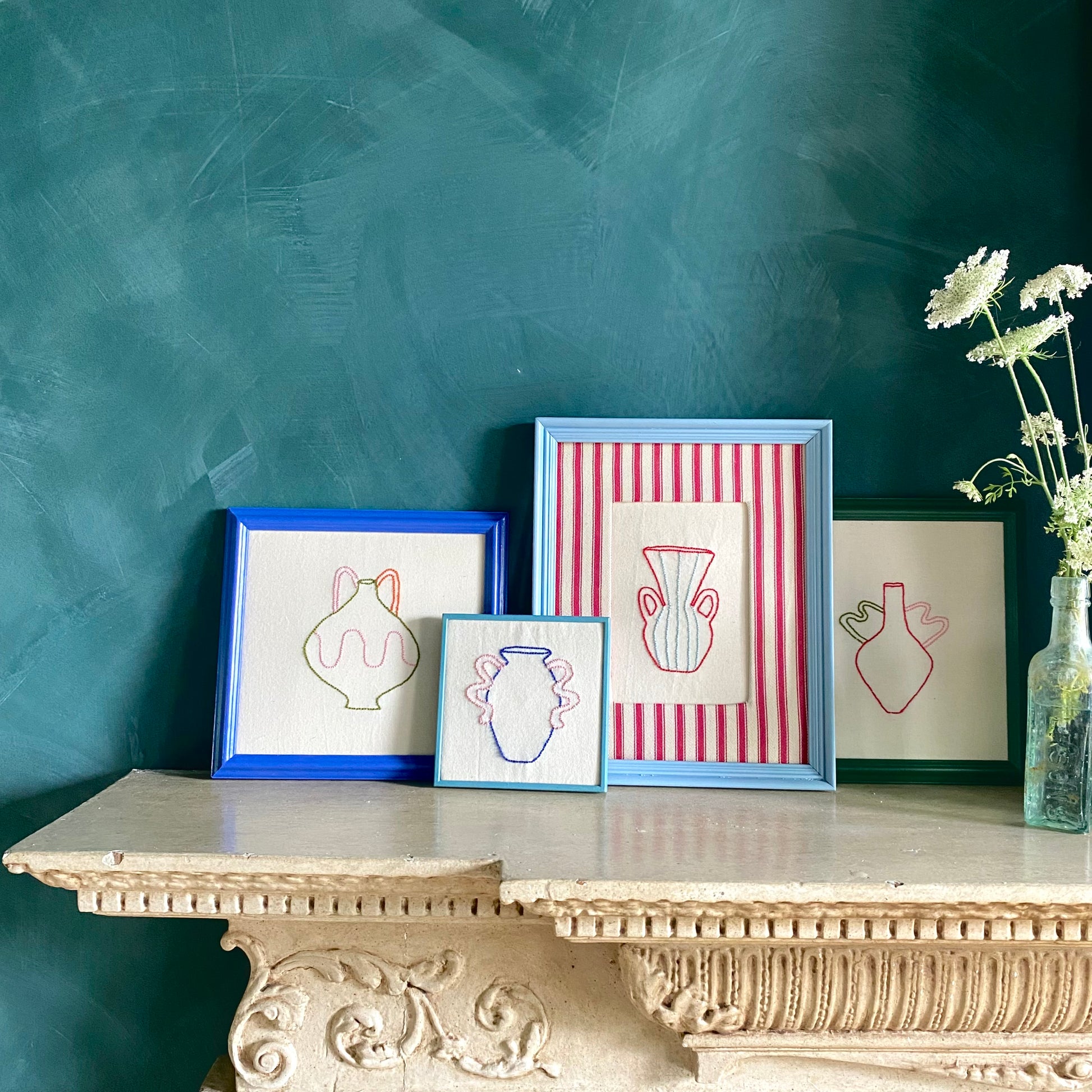 Embroidered on calico with painted vintage frames.