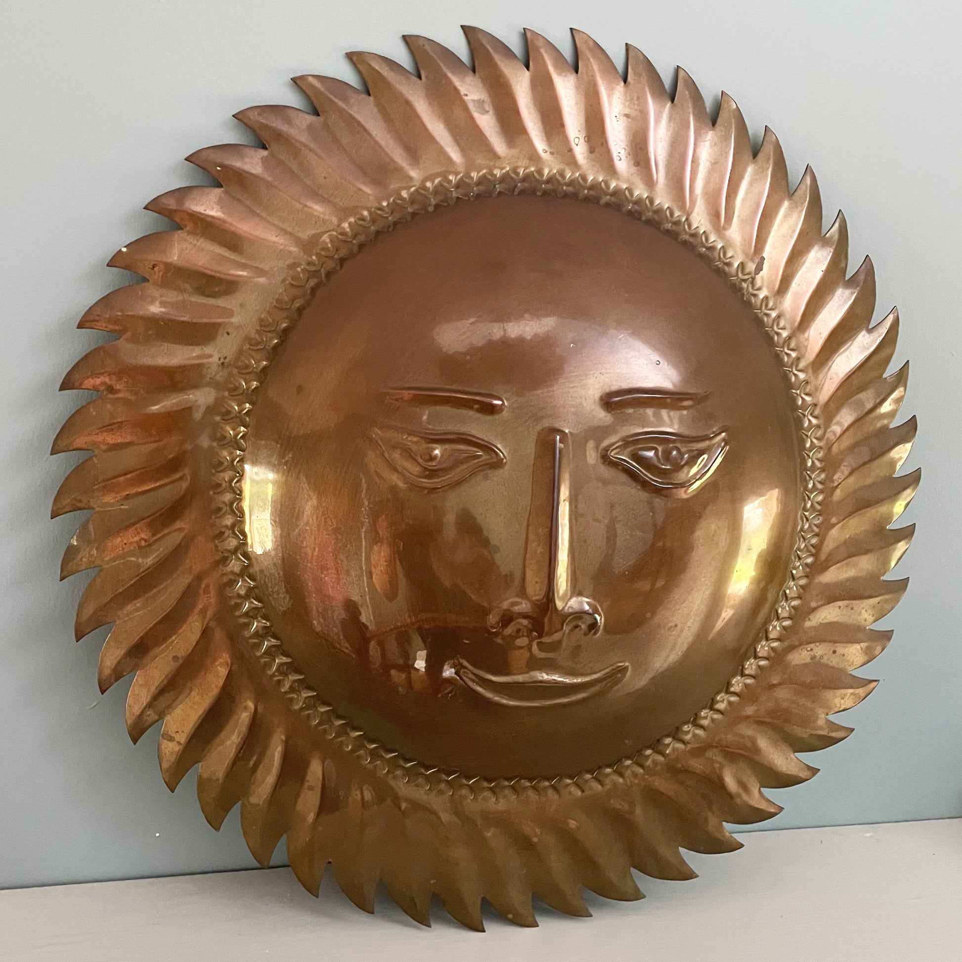 Large Mid-Century sunburst face wall hanging in brass. There are a few minor spots due to its age, but overall it's in great vintage condition.
