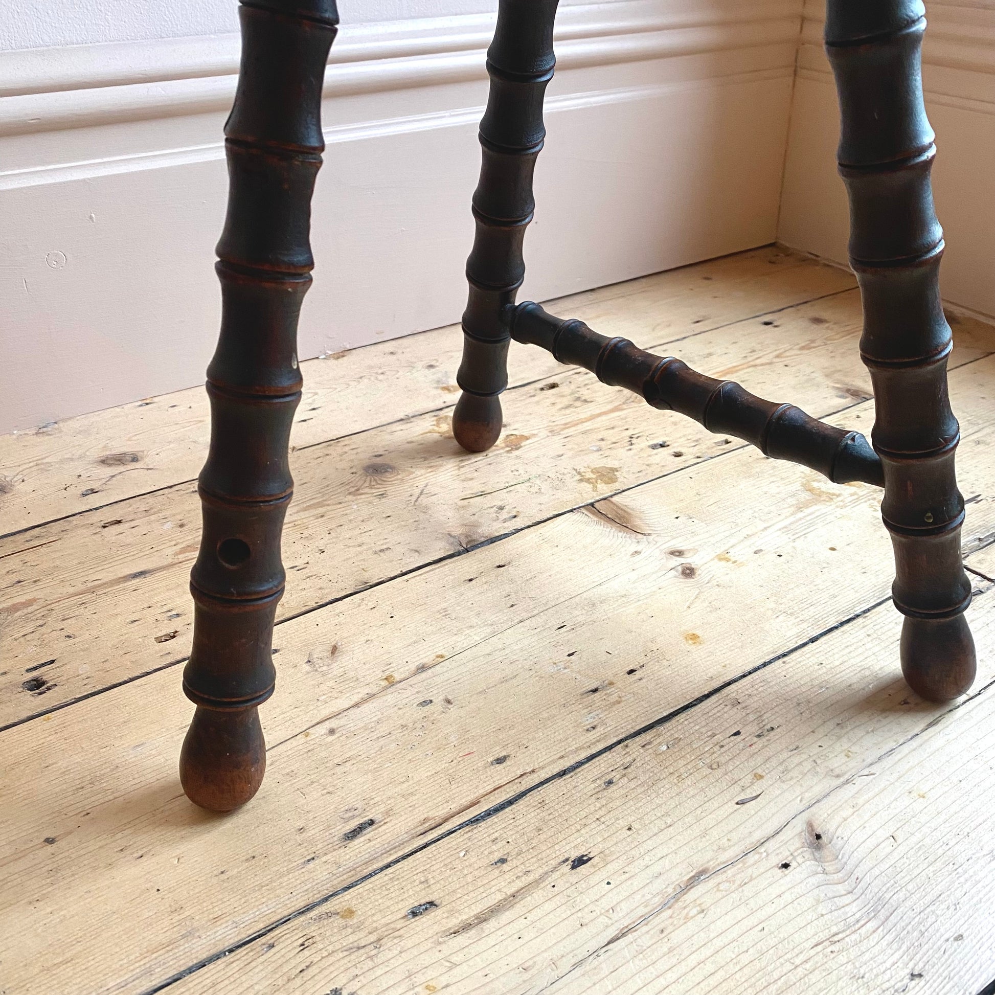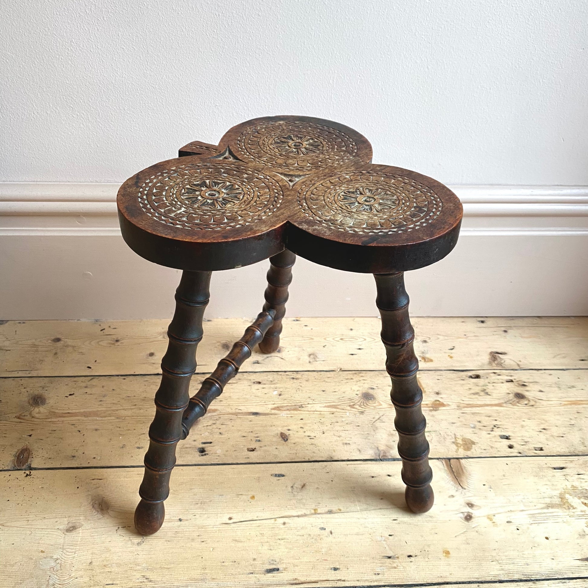 Vintage wooden cloverleaf stool with imitation bamboo legs. The stool's top has Eastern-style engravings and is in great vintage condition.