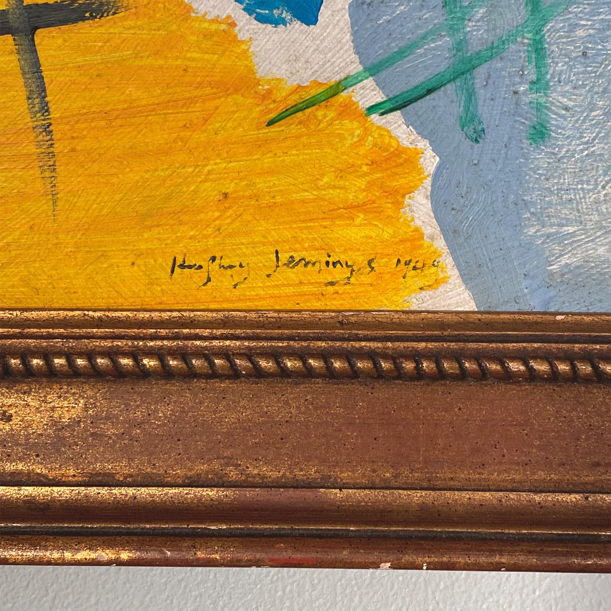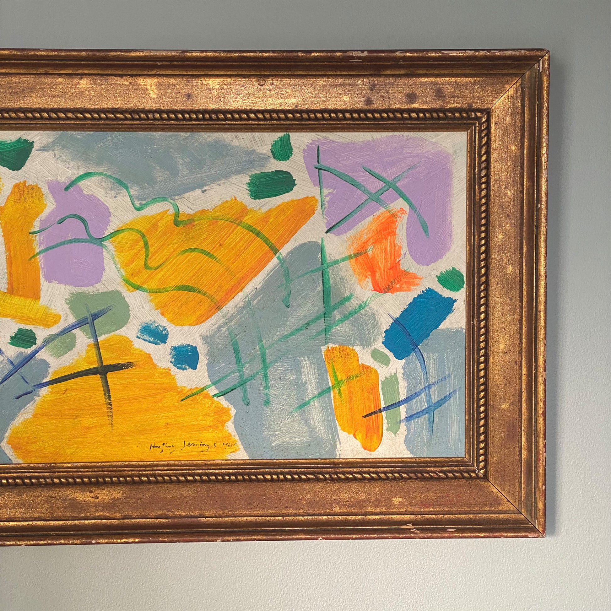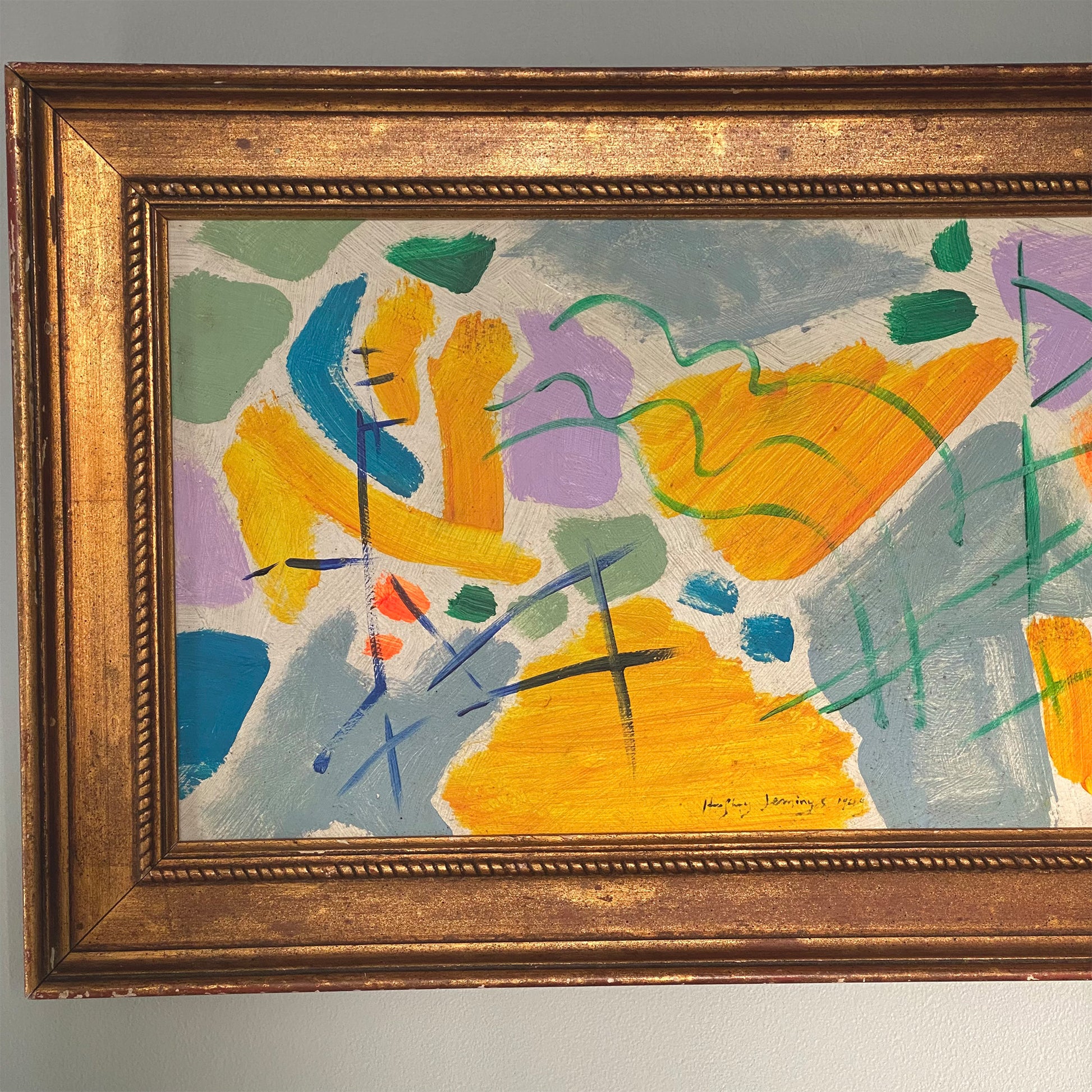 Gilt-framed abstract painting on board, signed Humphrey Jennings, 1949. In great vintage condition.