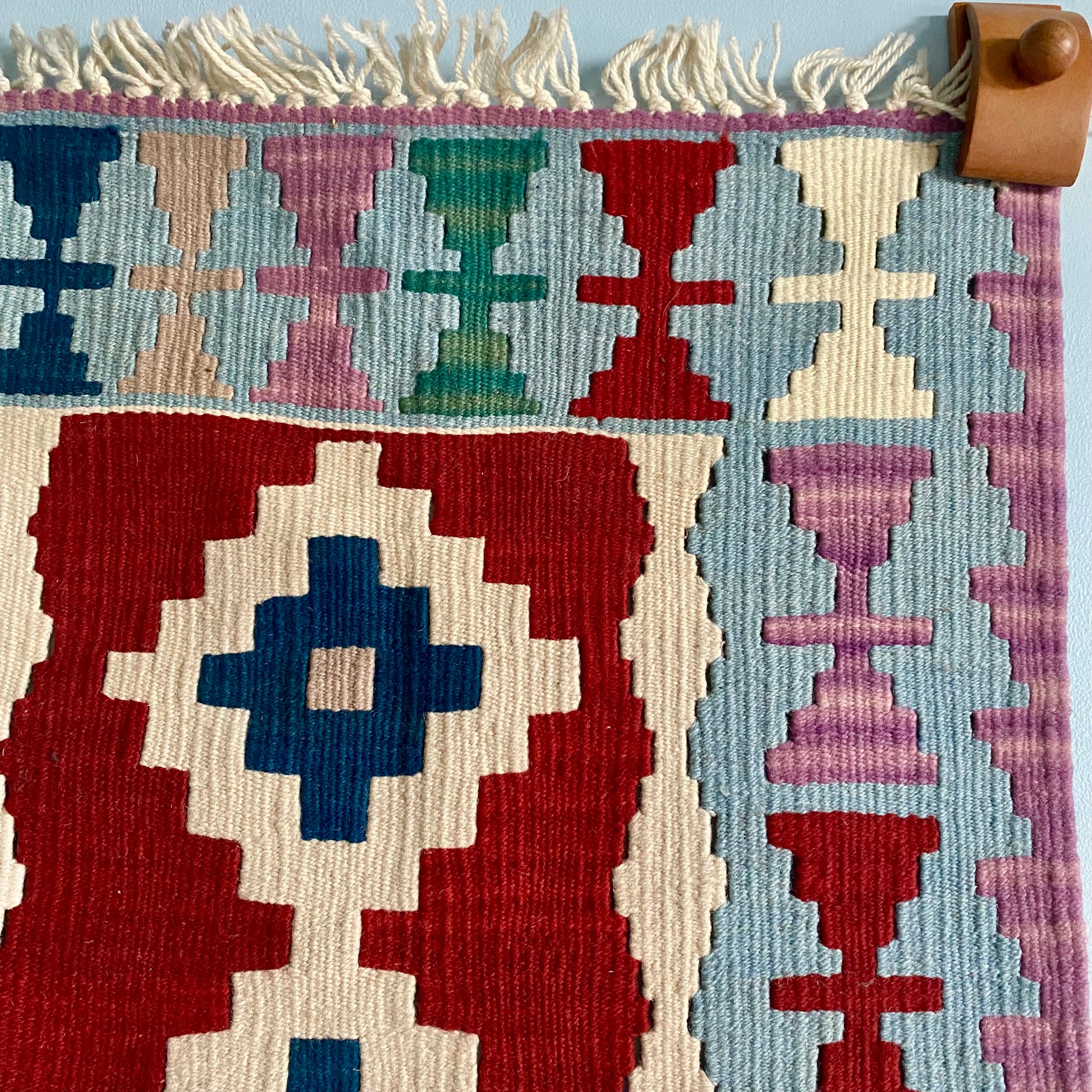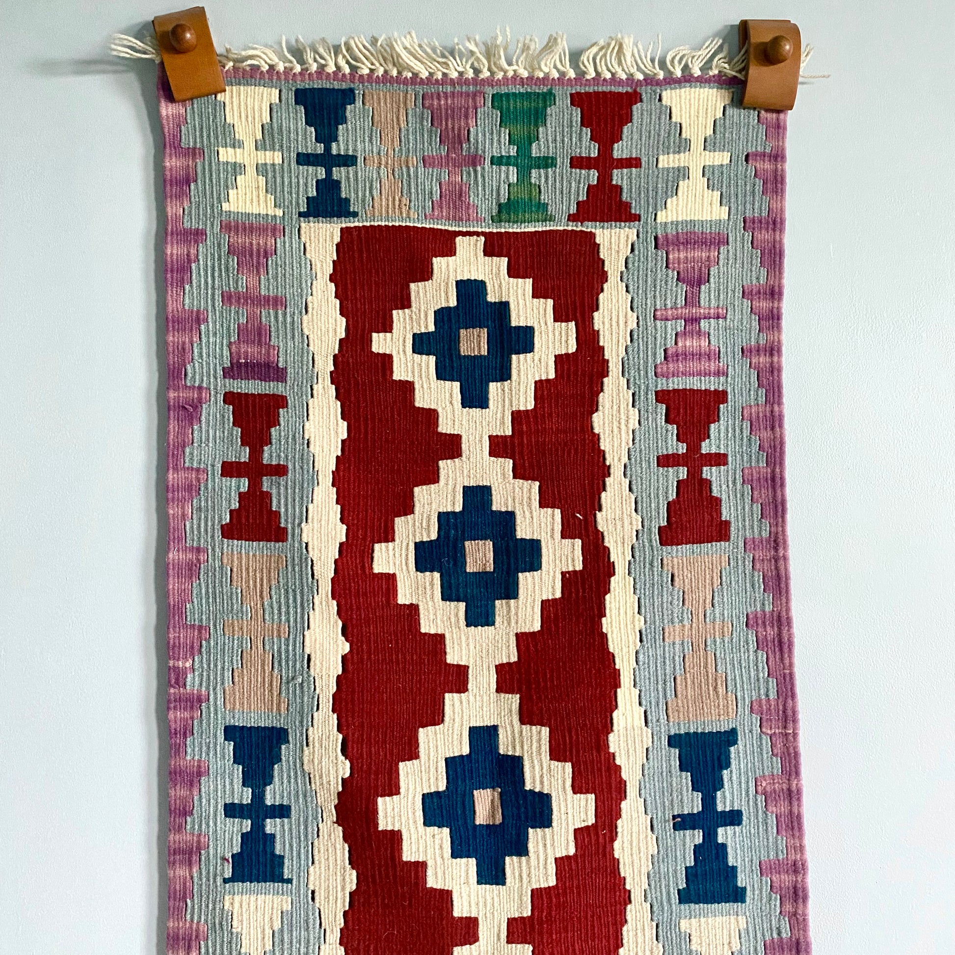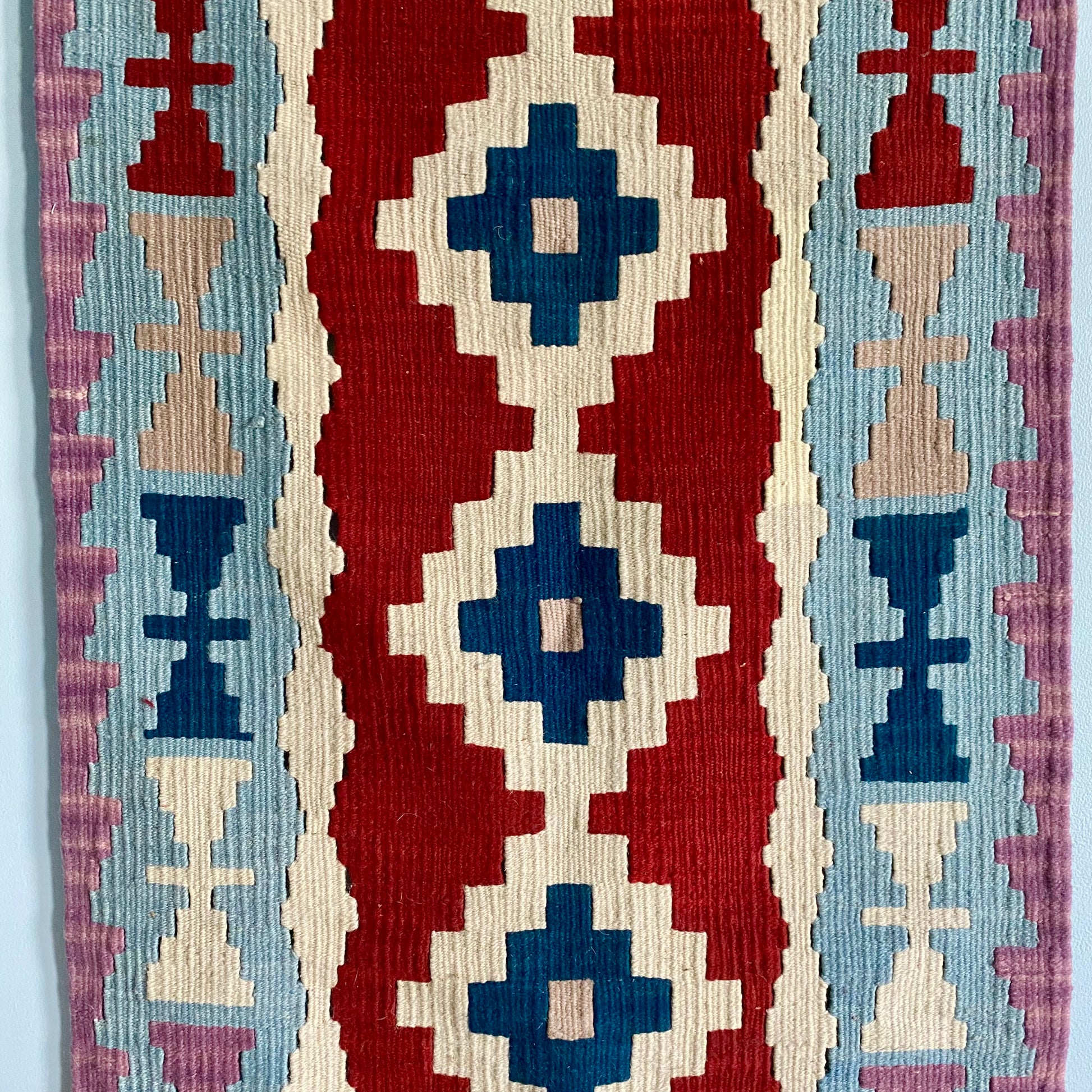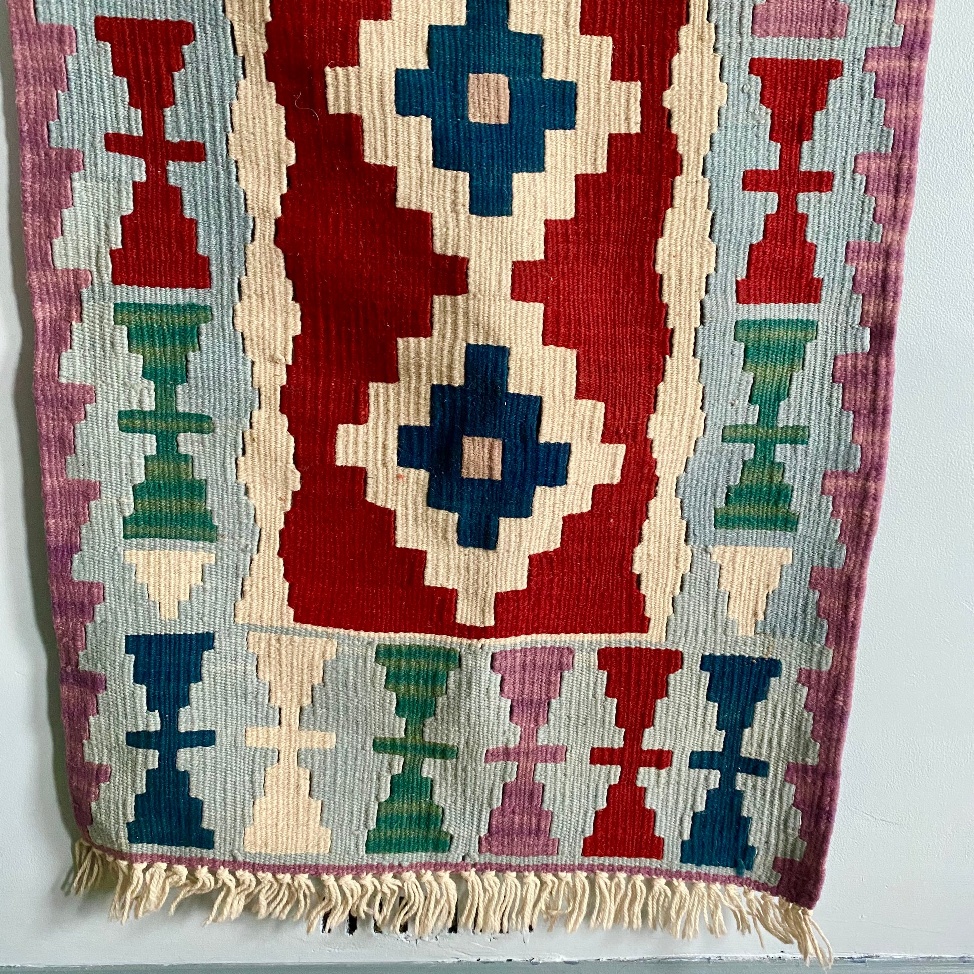 This kilim can be used as a runner or displayed as a unique wall hanging.