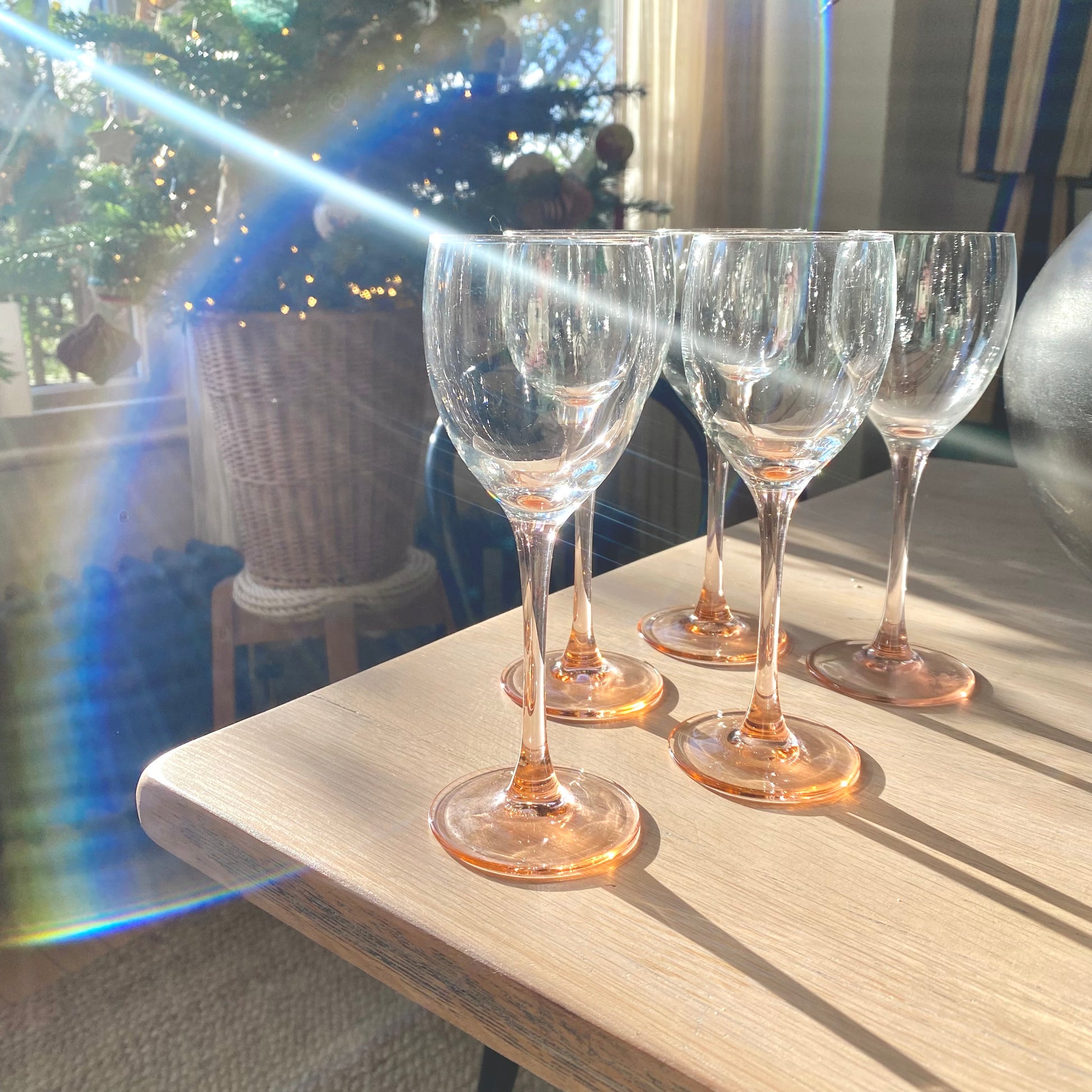 French rose-stemmed wine glasses, in excellent vintage condition. Available as a set of five.