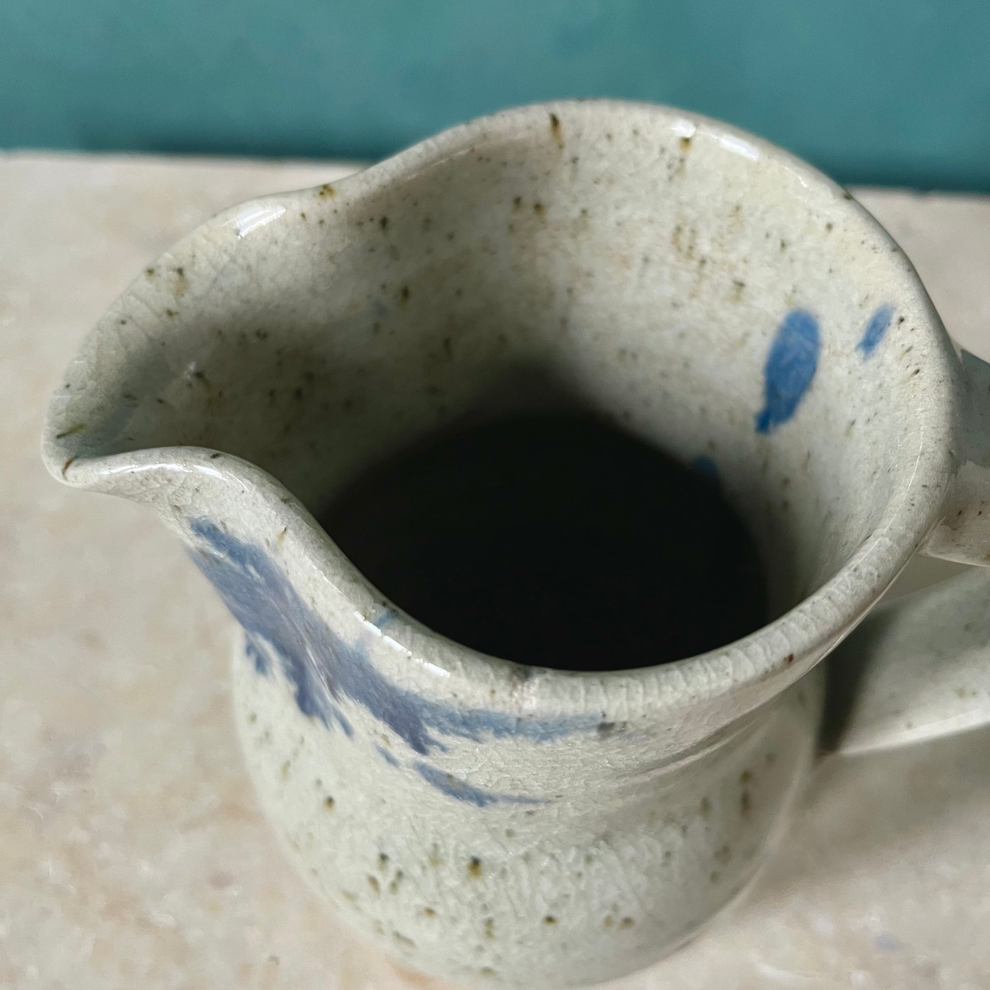 The jug has a soft speckled crackle greige glaze with a single expressive blue brush stroke.