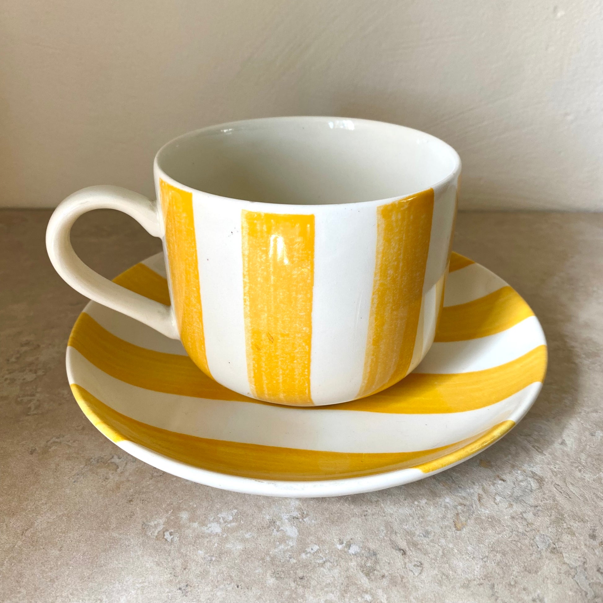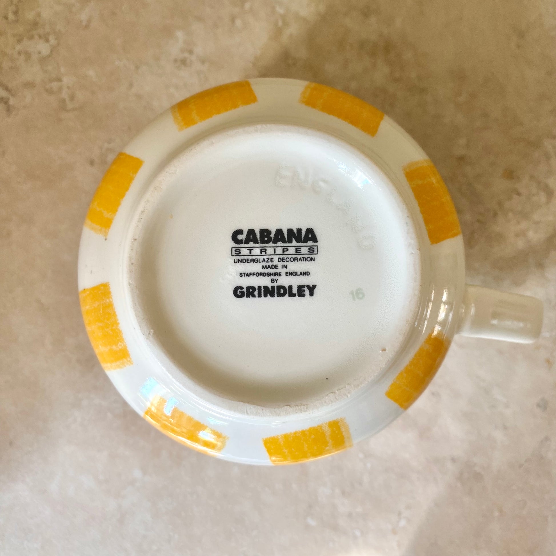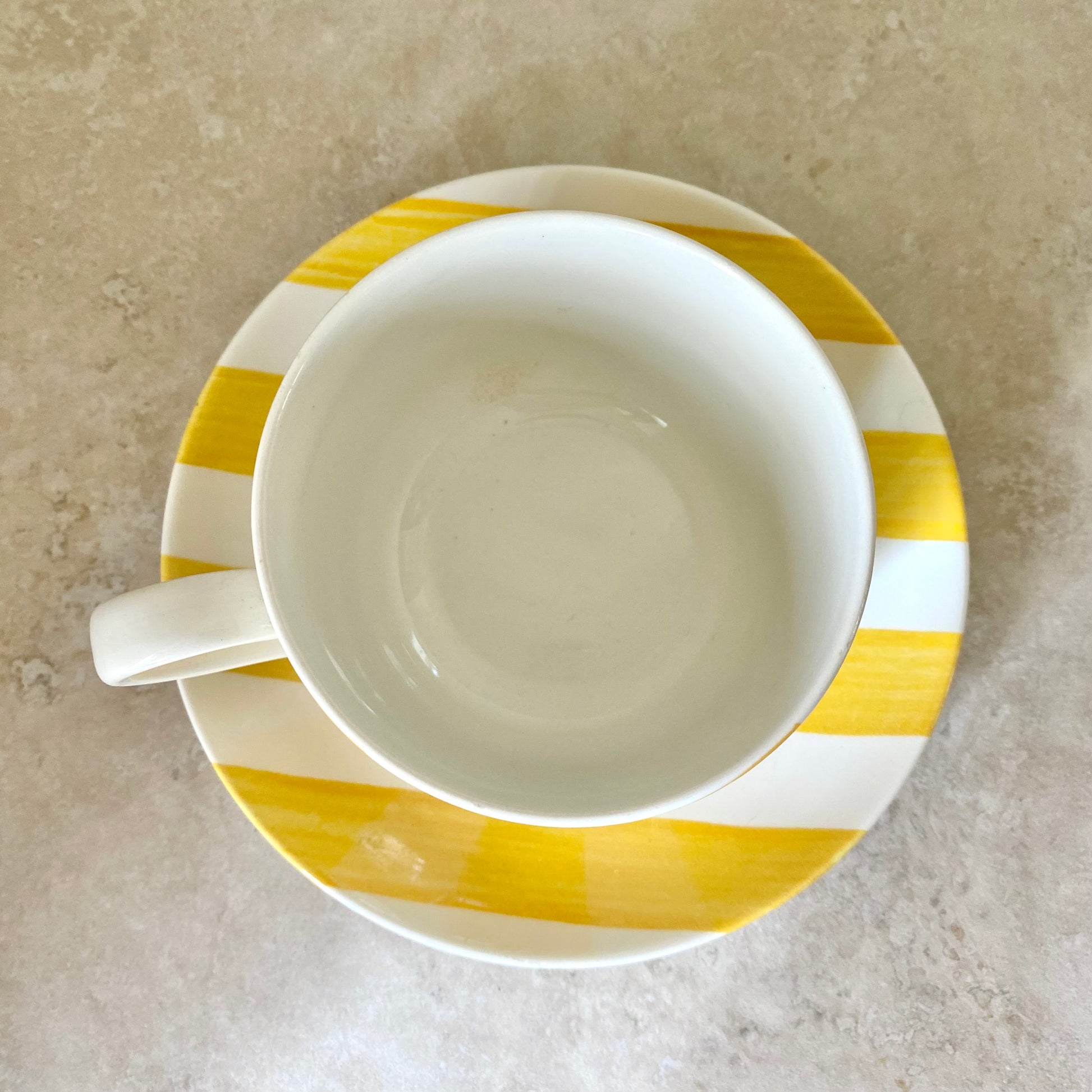 Set of two sunny yellow and white striped breakfast cups and saucers from Grindley’s Cabana Stripes collection. Classic retro style in great vintage condition, with minor glaze wear on the inside of the cups. No chips.