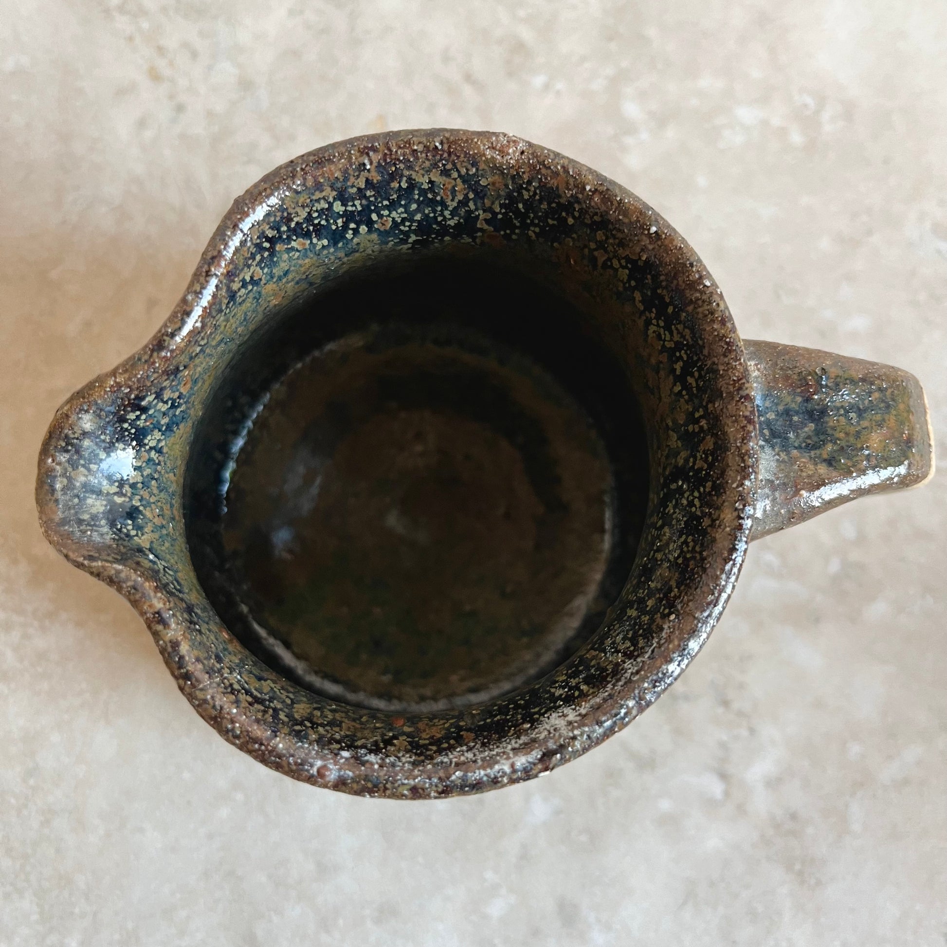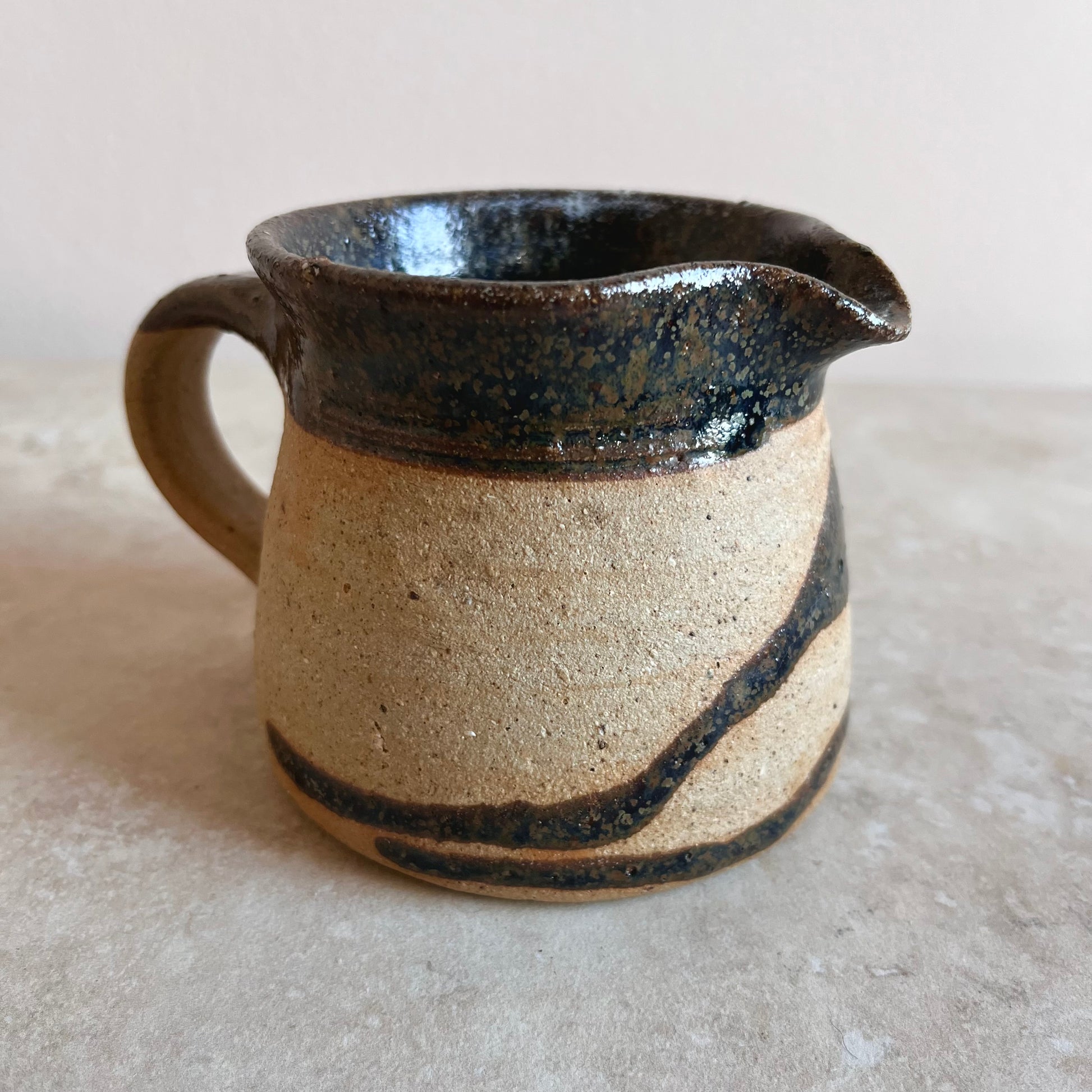 Cute studio pottery jug in stoneware and with pattern in a warm mottled brown glaze.