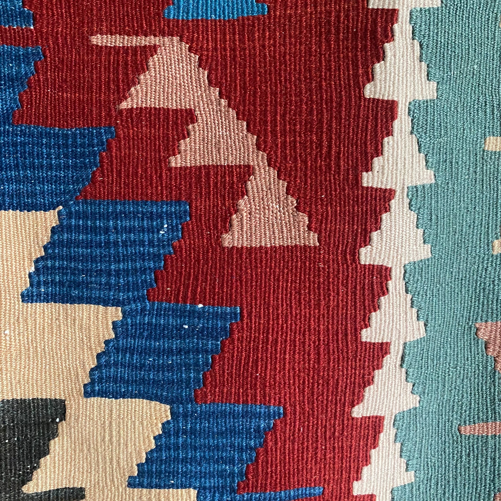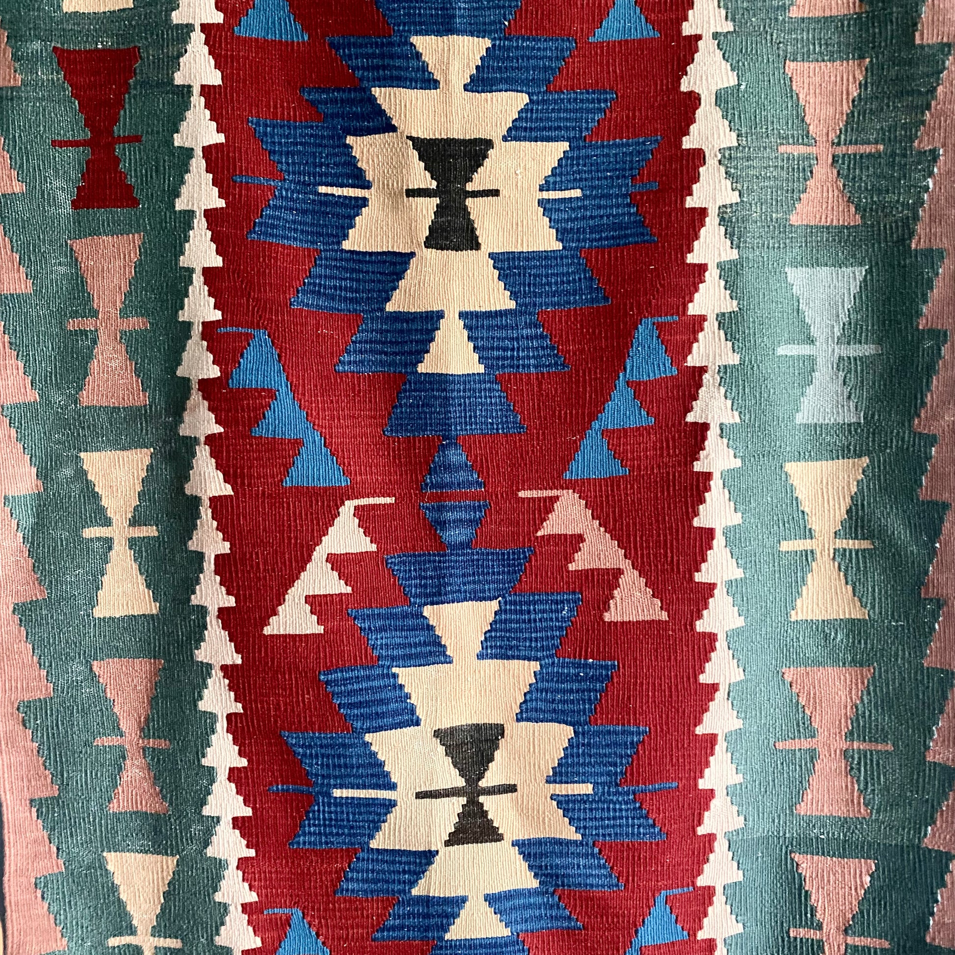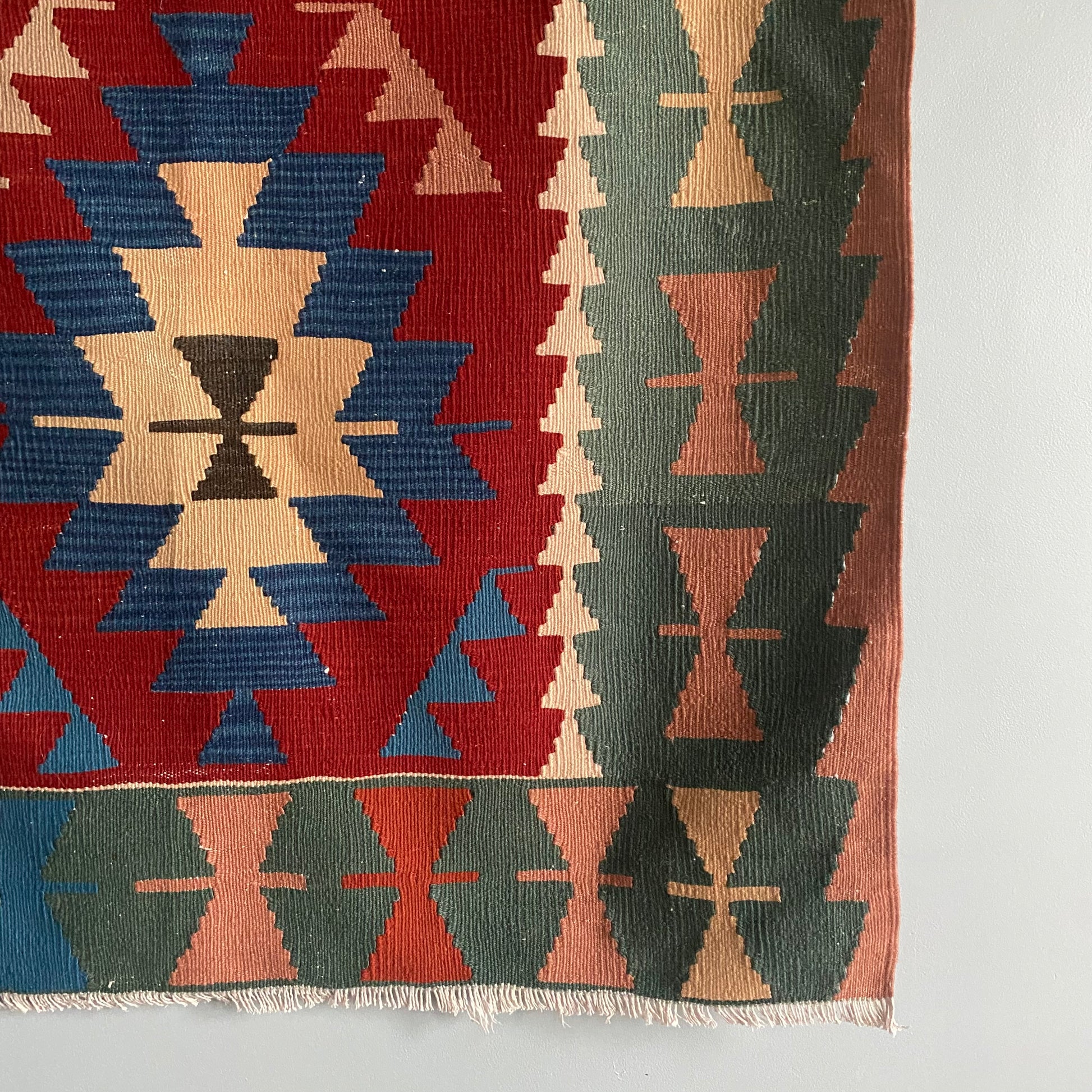 This beautiful vintage Turkish kilim is handwoven in the historic town of Kayseri in Western Anatolia. A true testament to traditional village craftmanship, this piece was skill-fully made by female artisans using age-old weaving techniques passed down through generations.