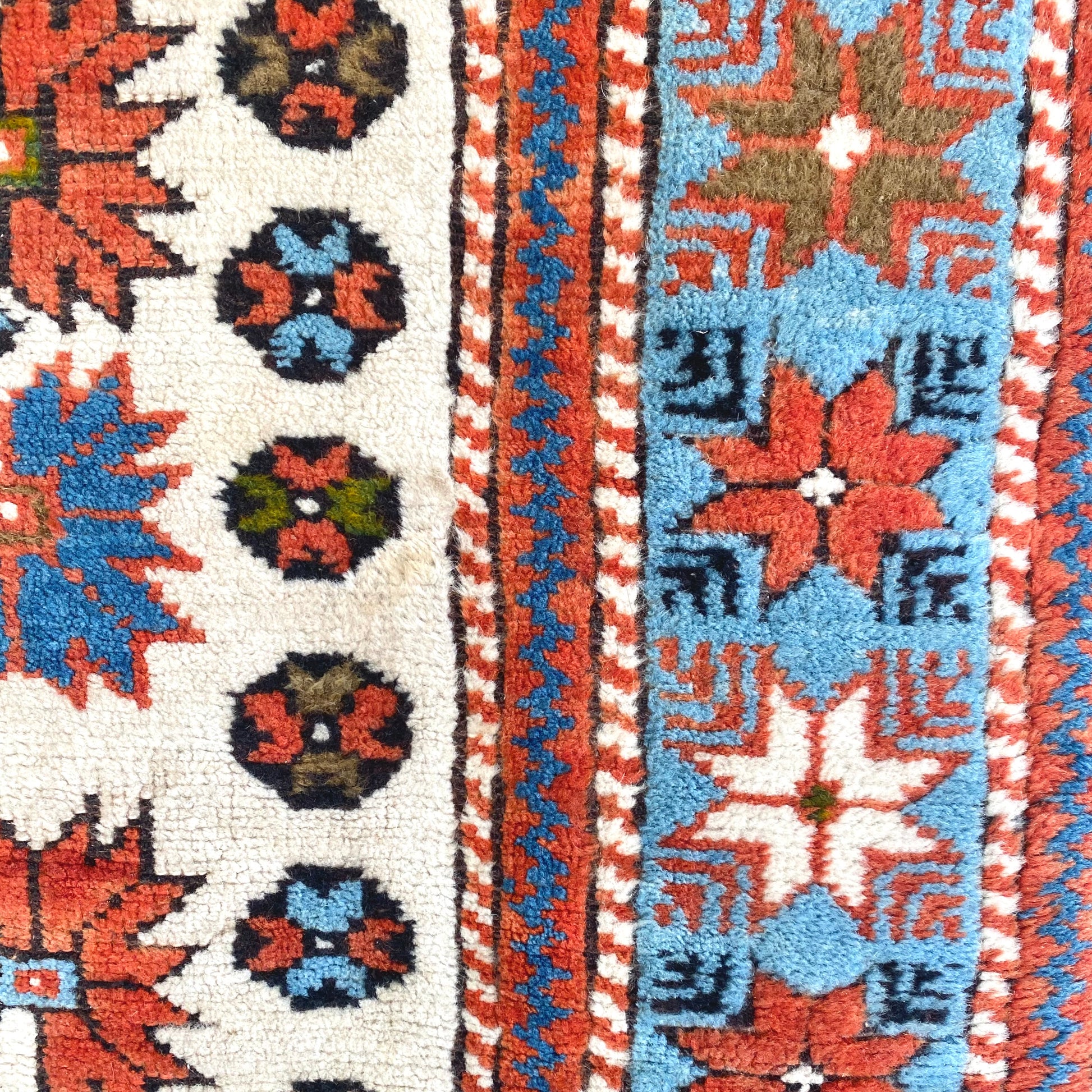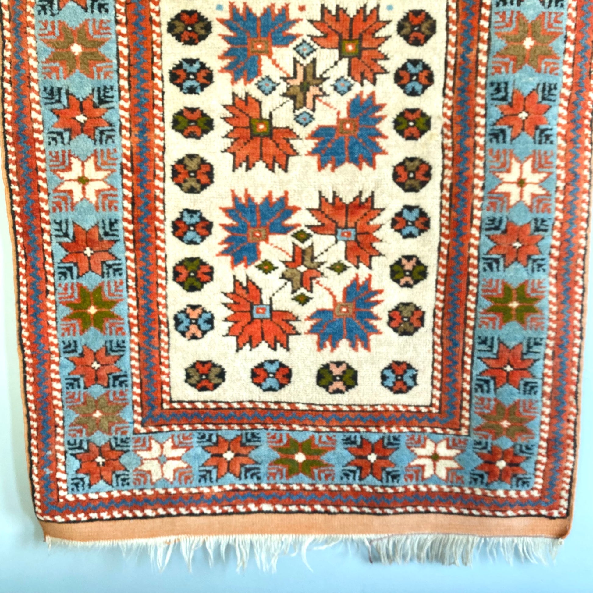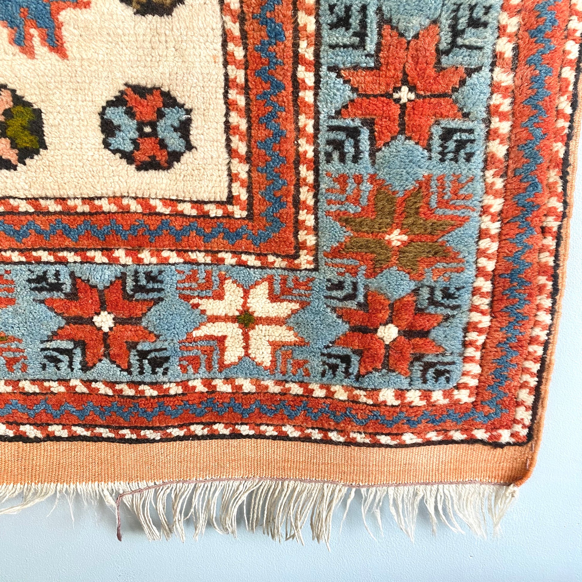 Vintage Turkish low pile rug in peach, cream and pale blue. There is one small mark (image 3) but the rug is otherwise in great vintage condition.